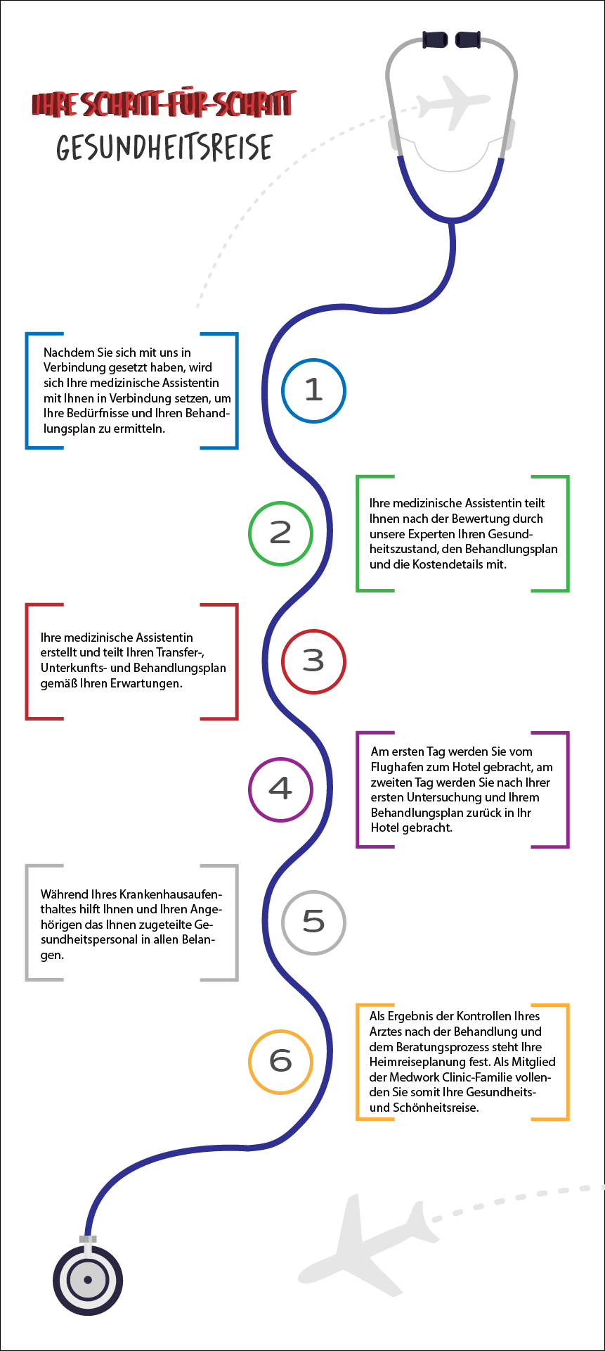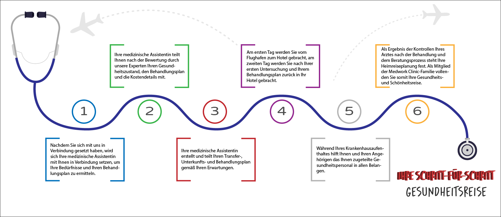 Sie können Ihre aktuellen medizinischen Daten und Gesundheitsberichte an unser Team richten, damit wir Sie kompetent zu Ihrer Situation beraten können. Nach der Bewertung durch unsere Experten können Sie Informationen zu Ihrem Gesundheitszustand, Behandlungsplan und Kostendetails erhalten. In dieser Phase können Sie sich gerne an uns wenden und so viele Fragen stellen, wie Sie möchten.